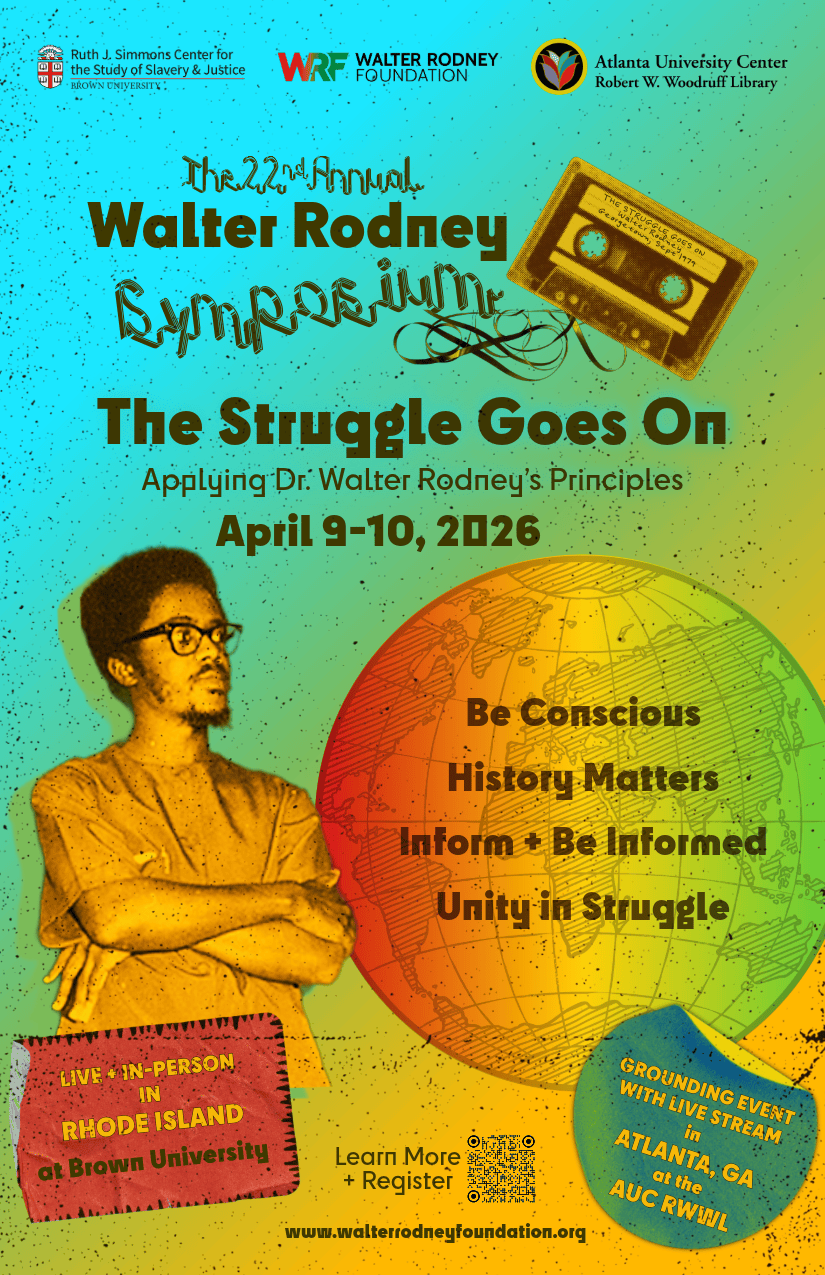 Since 2004, the Walter Rodney Foundation has hosted an annual symposium has been held in Atlanta, Georgia or virtually around the week of Walter Rodney’s birthday (23 March). The 22nd Annual Walter Rodney Symposium is entitled “The Struggle Goes On: Applying Dr. Walter Rodney’s Principles.” This is an inaugural event at Brown University in Providence, RI—the first hosted outside of Atlanta—with a local viewing event in Atlanta, GA at the Atlanta University Center Robert W. Woodruff Library. Virtual viewing of the symposium will be also available via streaming link.
